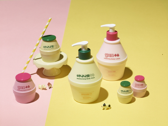 올리브영의 '라운드어라운드X바나나맛우유' 협업 보디케어 라인은 '라운드어라운드 바나나맛우유 모이스춰라이징'과 '라운드어라운드 딸기맛우유 바이탈라이징' 2종으로 이번에 출시됐다. 전상희 기자 nowater@sportschosun.com