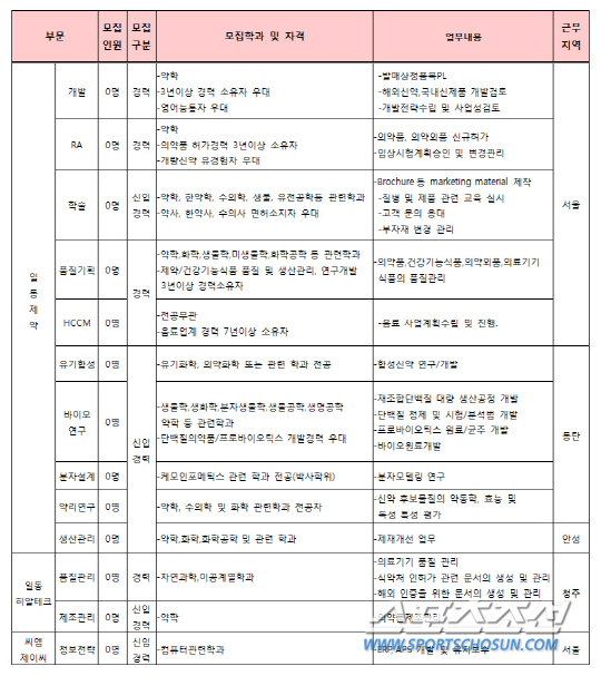 모집 분야는 개발, RA(인허가), 학술, 품질기획, HC CM(헬스케어 카테고리 매니저), 연구부문, 생산부문 등이며 분야별 중복 지원은 불가하다.