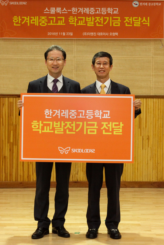학생복 전문 브랜드 스쿨룩스는 23일 오전 북한 이탈 청소년을 위한 학교인 한겨레중고등학교에 방문하여 학교발전기금을 기탁했다고 밝혔다.