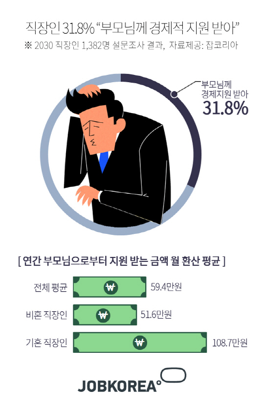 잡코리아는 경제 지원 여부와 마찬가지로 지원받는 금액에 있어서도 결혼 여부에 의한 차이가 두드러졌다고 밝혔다. 연간 직장인들이 부모님께 지원받는 금액을 월 단위로 환산하여 직접 기재하게 한 결과 성별에 따른 차이는 월 평균 5만원에 그친 데 비해 결혼 여부에 따라서는 2배 이상 큰 폭으로 벌어져 57만원에 달했다. 잡코리아 설문조사에서 비혼자는 월 평균 51.6만원을 부모님께 지원받고 있다고 답한 데 반해 기혼자들이 입력한 지원금액은 월 평균 108.7만원으로 나타났다.