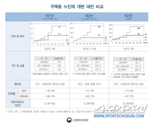 1안은 1단계는 필수사용량인 200kWh 이하, 2단계는 평균 사용량인 201∼400kWh, 3단계는 401kWh 이상으로 구분했다. 구간별 요율은 1단계는 104원, 2단계는 평균 판매 단가인 130원, 3단계는 1단계의 3배인 312원이다.