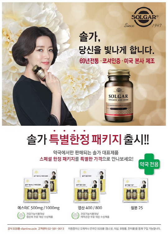 솔가는 대표 제품인 에스터C와 엽산, 그리고 철분을 2+1형태로 구성한 약국 전용 패키지를 통해 소비자들이 약국에서도 더욱 합리적인 가격으로 구매할 수 있도록 했다. 약국에서는 이용중인 도매처나 팜스넷, 더샵, 유팜몰, 한미몰 등 온라인 B2B몰에서 주문할 수 있다. 이번 프로모션의 주요 제품인 '솔가 에스터C'는 미국에서 높은 흡수율과 체내 이용률로 특허를 받은 비타민C이다. 또한 임산부들 사이에 널리 알려진 '솔가 엽산'과 함께 2016 건강기능식품대상에서 각각 항산화 부문과 태아건강 부문 대상을 차지한 바 있다.