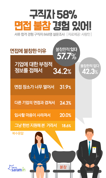 구직자 2명 중 1명은 올해 구직활동을 하며 면접에 불참한 경험이 있는 것으로 조사됐다.