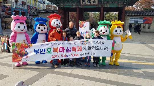 전라북도 부안군의 대표 축제인 '마실축제' 홍보캐릭터 '오복이'가 25~26일 서울 청계천-시청앞 광장에서 축제 홍보에 나섰다.