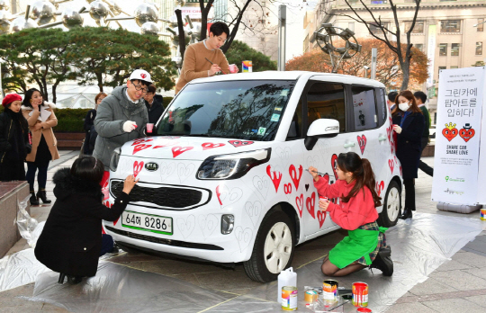 카셰어링 그린카는 28일 서울 소공동 롯데호텔 앞에서 셰어링카 페인팅 퍼포먼스를 진행하고 전기차 '레이EV' 팝아트 스페셜 에디션을 선보였다.