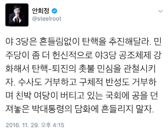 수사도 거부하고 구체적 반성도 거부하며 친박 여당이 버티고 있는 국회에 공을 던져놓은 박대통령의 담화에 흔들리지 말자.