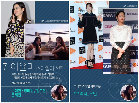 배우 손예진, 정려원, 김고은, 문채원 등 예쁘기로 소문난 대한민국 대표 배우들의 스타일링을 책임지고 있는 스타일리스트 이윤미는 전체 투표수 1,036표 중 302표를 받아 29.15%의 비율로 1위를 차지했다. 이윤미는 2015 패셔니스타 어워즈의 레전드 부문 우승자 정윤기 대표가 이끄는 인트렌드 소속의 스타일리스트. 역시 그 감각은 남달랐다. 그녀의 손길이 닿은 배우들이 공식석상에 떴다 하면 패션으로 이슈 몰이를 하는 것은 기본. 언제나 스타들의 패셔너블한 룩을 만들어 내는 감각은 명불허전이다.