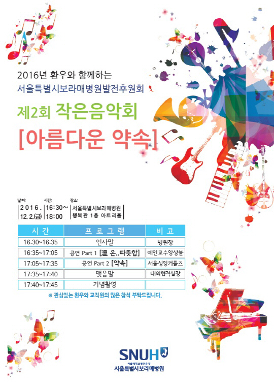 서울대학교병원운영 서울특별시보라매병원(원장 김병관) 발전후원회는 12월 2일 오후 4시 30분부터 6시까지 병원 행복관 1층 아트리움에서 환우와 함께하는 제2회 작은음악회를 개최한다고 밝혔다.