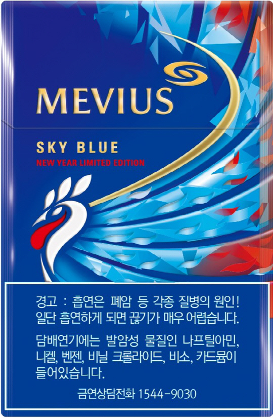 이번에 선보이는 '메비우스 스카이 블루 NEW YEAR 한정판'은 2017년 정유년을 기념해 출시된 것으로, 제품 패키지에 색감이 화려한 닭의 이미지를 삽입했으며 블루와 레드, 그리고 황금빛의 색 조합으로 고급스러운 팩 디자인을 완성했다. 미주, 아프리카, 유럽에서 선별된 최상의 담뱃잎을 사용하는 기존 메비우스의 부드러운 맛과 뛰어난 품질은 그대로 유지했다고 업체측은 설명했다.