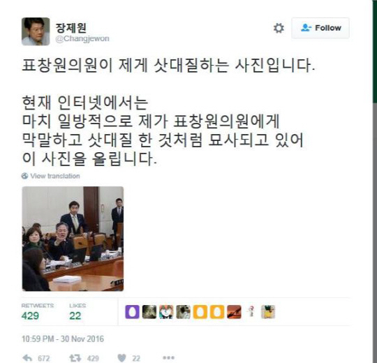 장제원 의원은 전날 표창원 의원이 여야 의원들을 탄핵 찬성-반대-주저로 분류한 명단을 공개한 것을 두고 반발했다. 이날 두 사람의 설전은 표창원 의원의 '페이스북 라이브' 등을 통해 중계되며 논란이 됐다.<스포츠조선닷컴>