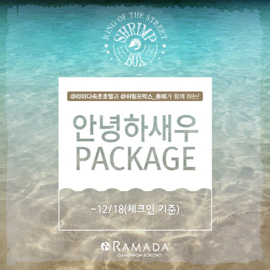 금번 출시한 '안녕하새우 패키지'는 객실과 스파 2인, 속초 쉬림프박스 2인으로 구성된 쉬림프박스 패키지로 오는 12월 18일(체크인 기준)까지 판매된다. 아울러 패키지 구매 고객들에게는 당일 속초 쉬림프박스 음료 1인 1,000원씩 할인 받을 수 있는 특전이 주어진다.