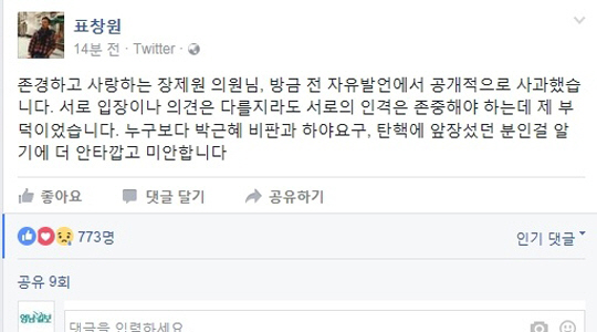 [스포츠조선닷컴 김영록 기자]더불어민주당 표창원 의원에 '삿대질 논란'에 휘말린 새누리당 장제원 의원에게 공식 사과했다.