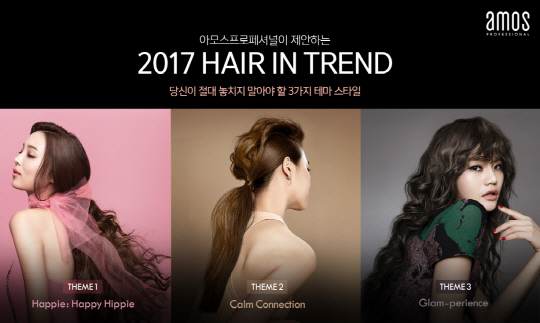 헤어 살롱 전문 브랜드 아모스프로페셔널이 2017 헤어 트렌드를 발표했다. 아모스프로페셔널이 정의한 2017 시즌 헤어 트렌드 키워드는 'Happie(행복한 히피), Calm Connection(캄 커넥션), Glam-Perience(글램 피어리언스)다.