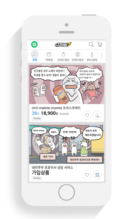 국내 인기 작가들과 협업해 웹툰 형태로 상품을 소개하는 방식으로, G마켓 핫딜 코너인 '슈퍼딜' 중 일부 상품을 선정해 제작 운영된다. 고객에게 재미와 정보를 동시에 제공하는 '쇼퍼테인먼트(Shopper-tainment)' 트렌드를 강화한다는 전략이다.