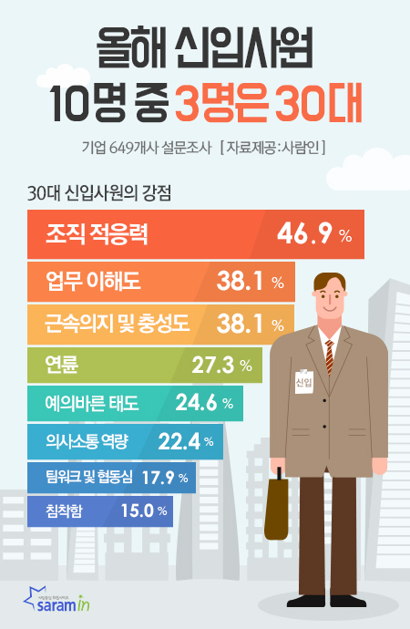 30대 신입사원이 20대 신입사원 보다 뛰어난 점으로는 '조직 적응력'(46.9%, 복수응답)이 1위를 차지했다. 뒤이어 '업무 이해도'(38.1%), '근속의지 및 충성도'(38.1%), '연륜'(27.3%), '예의 바른 태도'(24.6%), '의사소통 역량'(22.4%), '팀워크 및 협동 능력'(17.9%), '침착함'(15%) 등이 있었다.