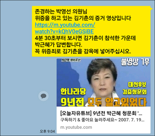 여기에 그치지 않았다. 휴대폰 메신저를 통해 더불어민주당 국정조사 위원인 박영선 의원에게 실시간으로 제보했다. '존경하는 박영선 의원님, 위증을 하고 있는 김기춘의 증거 영사입니다. 4분30초부터 보시면 김기춘이 참석한 가운데 박근혜가 답변합니다' '4분30초쯤 최태민 목사의 자녀인 최순실을 조사했고, 특히 최순실씨의 재산취득과정을 집중조사했다고 언급합니다' 등의 메시지와 함께 증거 영상을 링크했다.