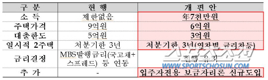 개편에 따라 2017년 1월 1일부터 보금자리론을 이용할 수 있는 주택가격 기준은 9억원에서 6억원으로, 대출한도는 5억원에서 3억원으로 각각 낮아진다. 또, 기존에는 제한이 없었던 부부합산 소득 요건도 연 7000만원 이하로 제한했다.