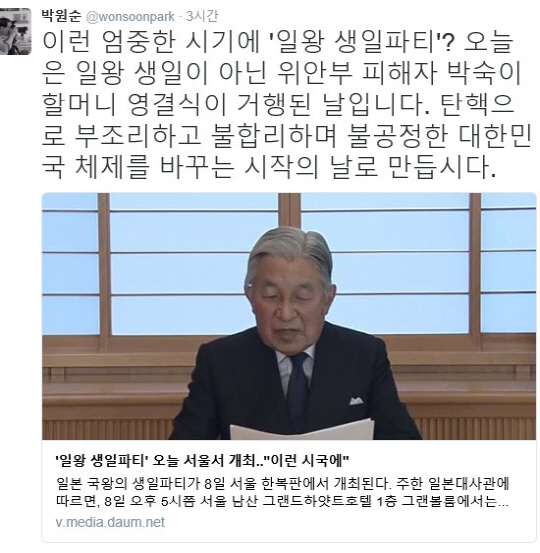 8일 박원순 시장은 자신의 SNS에 "이런 엄중한 시기에 '일왕 생일파티'? 오늘은 일왕 생일이 아닌 위안부 피해자 박숙이 할머니 영결식이 거행된 날이다. 탄핵으로 부조리하고 불합리하며 불공정한 대한민국 체제를 바꾸는 시작의 날로 만들자"라는 글을 게재했다.