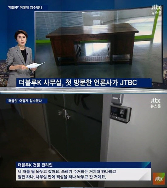 JTBC에 따르면, 특별취재팀은 더블루K 사무실에서 찾았다. 독일 비덱 스포츠에 대해 취재하던 중 더블루K 사무실로 찾아가 태블릿PC를 찾았다. 텅 빈 사무실의 빈 책상 위에서 태블릿PC와 서류 등을 발견했다. 이와 함께 당시 책상 사진을 공개했다.