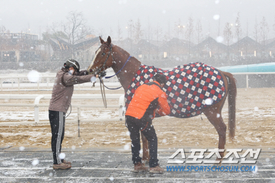 지난달 26일 수도권일대 첫눈이 내리며 본격적인 겨울의 시작을 알렸다. 렛츠런파크 서울 경주로에도 함박눈이 쏟아진 가운데 경주마들이 눈보라를 가르며 설원을 질주하는 진풍경이 펼쳐졌다. 하지만 뚝 떨어진 기온으로 말들이 감기에 걸리지 않을까, 경마 관계자들의 손이 바삐 움직였다. 억대 몸값을 자랑하는 경주마들의 VIP급 이색겨울나기를 들여다보자.