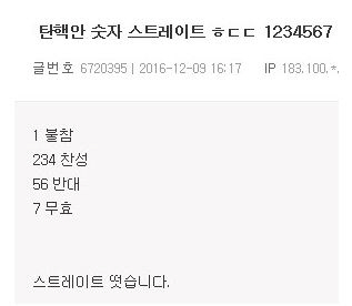촛불 민심의 중심이 된 네티즌들이 압도적 가결이라는 결과에 각종 패러디물을 쏟아내고 있는 가운데 이번 투표 결과가 '우주의 기운을 모은 것'이라는 주장(?)이 각 온라인 커뮤니티에서 제기되고 있다. 기권표와 찬성·반대·기권의 집계수를 일렬로 세우면 '1·234·56·7'로 스트레이트로 숫자가 이어진다. '우주의 기운이 담긴 투표' '탄핵안 숫자 스트레이트 ㅎㄷㄷ 1234567''스트레이트가 떴습니다'라고 쓴 게시물들이 온라인을 타고 일파만파 퍼져나가고 있다. <스포츠조선닷컴>