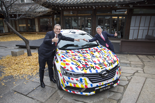 르노삼성자동차는 한불수교 130주년을 기념하고 한불 합작인 SM6의 성공을 축하하기 위해 14일 서울 삼청동 현대갤러리 두가헌에서 세계적인 팝아티스트 까스텔바작을 초청, 아트 퍼포먼스로 꾸민 'SM6 X 까스텔바작 아트카'를 공개했다.