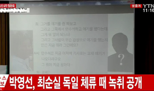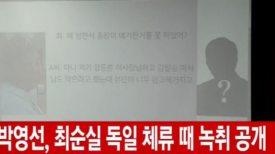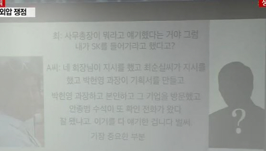 최씨는 측근 A씨와 통화중 " (정현식) 사무총장이 뭐라고 얘기했다는 거야, 그럼 내가 SK를 들어가라고 했다고?"라고 묻는다. A씨는 "네 회장님이 지시를 했고, 최순실씨가 지시를 했고, 박헌영 과장이 기획서를 만들고, 박헌영 과장하고 본인하고 그 기업을 방문했고, 안종범 수석이 또 확인전화가 왔다. 잘됐냐고… 이거를 다 얘기한 겁니다"라고 상황을 말한다. 최씨가 "왜 정현식 총장이 얘기한 거를 못막았어?"라고 묻자, A씨는 "아니 정동춘 이사장님하고 김필승 이사님도 막으려고 했느데 본인이 너무 완고해가지고"라고 답했다. 최씨는 안종범 청와대 수석을 연거푸 언급한다. "그거를 얘기를 좀 짜보고, 그리고 그쪽에서 안수석하고 얘기를 했다는데 그게 뭐 말이 되느냐, 그리고 그 사람이 무슨 감정으로 얘기를 했는지, '안'은 지금 뭐라 그런데요?"라고 묻자 A씨가 "안수석은 지금 어저께 기사로는 교체 얘기가 나오더라고요"라고 답하고 최씨는 "교체?"라고 반문하는 내용이 녹취 파일에 고스란히 담겼다. <스포츠조선닷컴>