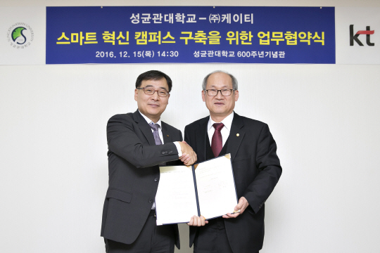 KT와 성균관대학교가 글로벌 수준의 스마트 혁신 캠퍼스 구축을 위한 양해각서(MOU)를 15일 체결했다. 사진은 협약식에 참석한 KT 기업사업부문장 이문환 부사장(왼쪽)과 성균관대 정상규 총장.