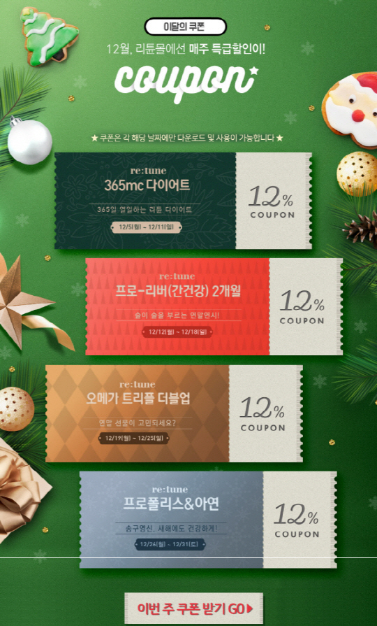 프리미엄 건강기능식품 브랜드 리튠은 연말을 맞아 매주 인기 건강기능식품의 12% 할인쿠폰을 증정하는 '이달의 쿠폰' 이벤트를 진행한다고 밝혔다.