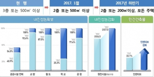 지진방재 종합대책'에 따르면 내년 12월에는 모든 주택 뿐만 아니라 현행 3층 또는 500㎡이상인 건축물의 내진설계가 2층 또는 200㎡이상 건축물로 확대된다.