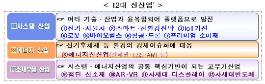 또한 신산업 민관협의회는 전기·자율차, 스마트선박, 사물인터넷(IoT)가전, 로봇, 바이오헬스, 항공·드론, 프리미엄소비재, 에너지신산업, 첨단신소재, 증강현실(AR)·가상현실(VR), 차세대 디스플레이, 차세대 반도체 등 미래 대한민국을 먹여 살릴 12대 신산업을 이날 제시했다.