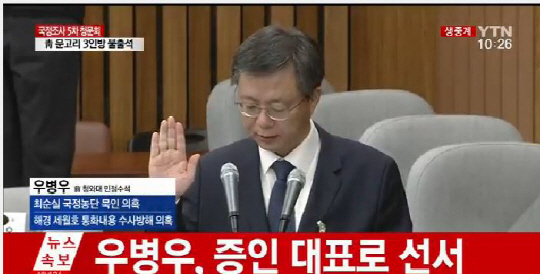 우 전 수석은 이날 서울 여의도 국회에서 오전 10시부터 열린 5차 청문회에 증인으로 출석해 증인대표로 선서했다. "양심에 따라 숨김과 보탬이 없이 사실 그대로 말하고 만일 진술이나 서면 답변에 거짓이 있으면 위증의 벌을 받기로 맹서한다"고 또박또박 선서했다.