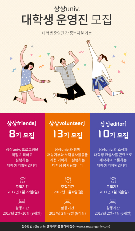 상상유니브 운영진은 대학생이면 누구나 상상유니브 홈페이지에서 지원할 수 있다. 모집기간은 '상상발룬티어'와 '상상에디터'가 1월 8일까지며 '상상프렌즈'는 1월 22일로, 선발이 된 대학생은 올해 2월부터 활동을 시작하게 된다. 장종호 기자 bellho@sportschosun.com