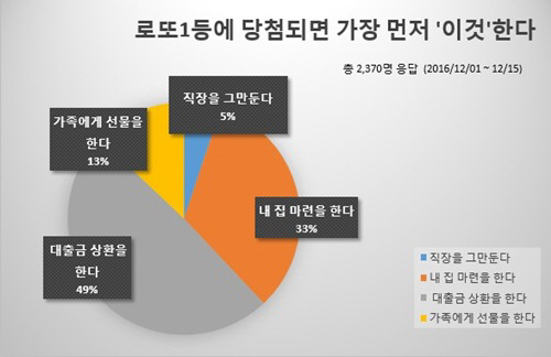 두번째로 많은 응답은 33%(778)명이 꼽은'내 집 마련을 한다'였다. 3명 중 1명 꼴로 현재 집이없다고 밝혔으며 로또에 당첨되면 집을 사고 싶다고 소망을 밝혔다.