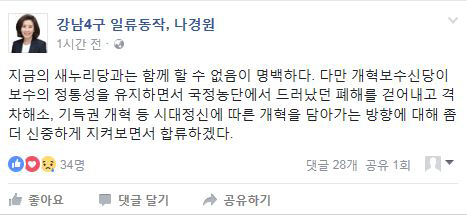 개혁보수신당이 이날 오전 10시 서울 여의도 국회에서 분당 선언 기자회견을 열고 1차 탈당자 명단을 발표할 것으로 알려진 가운데, 나 의원은 이날 오전 페이스북을 통해 자신의 입장을 밝혔다. "지금의 새누리당과는 함께 할 수 없음이 명백하다"면서도 "다만 개혁보수신당이 보수의 정통성을 유지하면서 국정농단에서 드러났던 폐해를 걷어내고 격차해소, 기득권 개혁 등 시대정신에 따른 개혁을 담아가는 방향에 대해 좀 더 신중하게 지켜보면서 합류하겠다"고 썼다. <스포츠조선닷컴>