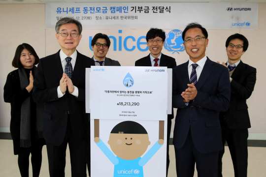 현대자동차가 27일 서울시 마포구에 위치한 유니세프 한국위원회에서 현대차 서비스사업부와 유니세프한국위원회 임직원들이 참석한 가운데 유니세프 모금액 전달식을 가졌다고 밝혔다.
