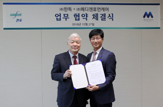 한독(회장 김영진)은 메디젠휴먼케어(대표 신동직)와 27일 개인별 유전적 질병 위험도를 분석하는 서비스인 'M-체크(M-CHECK)'의 공동 마케팅·영업 업무협약을 체결했다고 밝혔다.