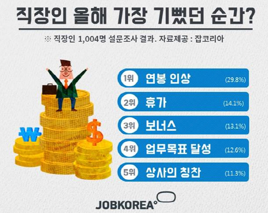 취업포털 잡코리아가 남녀 직장인 1004명을 대상으로 올 한해 직장생활을 하면서 가장 기뻤던 순간에 대해 설문조사를 진행한 결과, 연봉이 인상 되었을 때가 29.8%로 1위를 차지했다. 뒤이어 휴가 (14.1%), 보너스(13.1%), 업무목표 달성(12.6%), 상사의 칭찬 및 인정(11.3%), 승진(7.0%) 등의 순이었다.