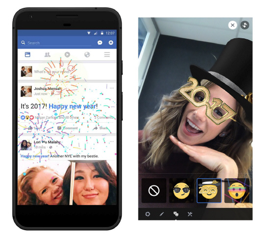 실시간 동영상 공유 기능인 '페이스북 라이브'에서 사용할 수 있는 새해 기념 마스크 효과도 함께 공개했다. 라이브 방송 도중 실시간으로 화면에 비친 얼굴에 2017년 숫자 도안의 선글라스와 모자 등을 덧입힐 수 있는 재밌는 기능이다.