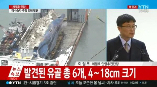 해수부는 이날 오후 4시 30분 진도군청에서 관련 브리핑을 열고 "갑판 위 세월호 선수 쪽 브리지 밑 A데크쪽 아래 리프팅빔을 받치는 반목 주변에서 4∼18㎝ 크기의 유골 6조각과 신발 등 유류품 일부가 발견됐다'고 밝혔다. <스포츠조선닷컴>
