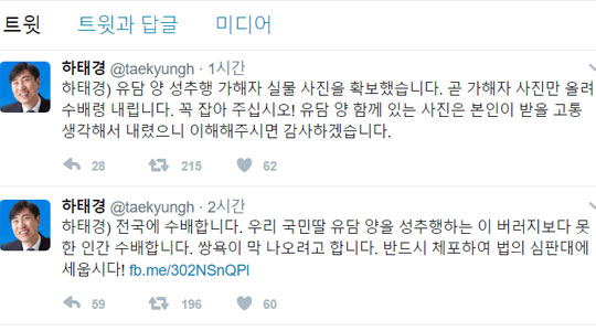 하태경 의원은 4일 자신의 SNS에 "전국에 수배합니다. 우리 국민딸 유담 양을 성추행하는 이 버러지보다 못한 인간 수배합니다. 쌍욕이 나오려고 합니다. 반드시 체포하여 법의 심판대에 세웁시다"라고 밝혔다.