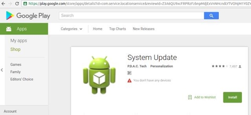 이 앱은 제목이 '시스템 업데이트'일뿐만 아니라 "이 애플리케이션은 특수한 위치 기능을 업데이트하고 사용 가능하도록 합니다"라는 설명도 달려 있다. 이 탓에 최신 안드로이드 업데이트를 제공하는 앱이라고 착각하고 내려받은 사용자들이 많았다.