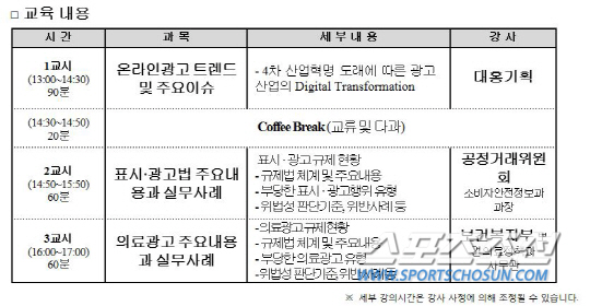 교육과목은 ▲표시·광고법 주요내용과 실무사례(공정거래위원회 이병건 과장) ▲의료광고 주요내용과 실무사례(보건복지부 오성일 사무관) ▲온라인광고 트렌드 및 주요이슈(대홍기획 김유나) 등이다.