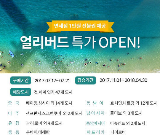 노선별 왕복 총액 최저 운임은 ▲호치민 25만원 ▲나트랑 26만원 ▲푸켓 27만원 ▲밴쿠버 52만원 ▲샌프란시스코 60만원 ▲암스테르담 56만원 ▲로마 56만원 ▲파리 60만원 등 총 47개 노선이며 환율 변동, 예약 시점에 따라 총액 운임은 변경될 수 있다.