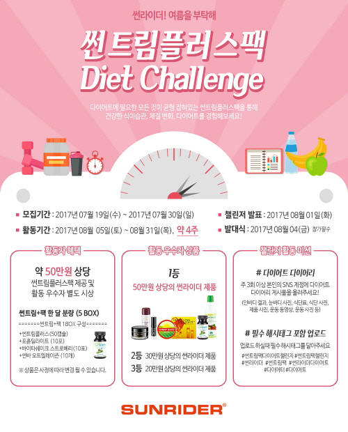한편, 썬트림 플러스팩 다이어트 챌린지 관련 자세한 사항은 썬라이더 코리아 공식 SNS에서 확인할 수 있다.