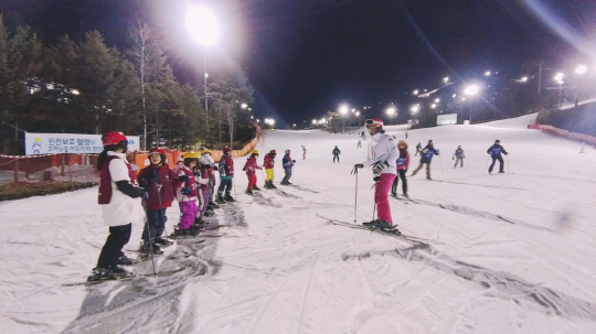 ◇'제2회 스포츠조선-오크밸리, 유소년 스키 별자리·문화캠프' 모습. 캠프 참가 학생들이 야간스키강습을 받고 있다.