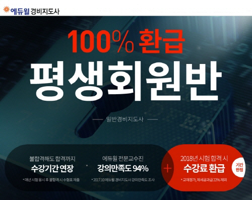 한편 에듀윌은 2018년 시험 합격시 수강료를 환급해주는 일반 경비지도사 '100% 환급 평생회원반'을 성황리에 운영중이다. 이 과정은 2018년 시험에 불합격한 수험생에게 수강기간 연장 기회를 제공한다.