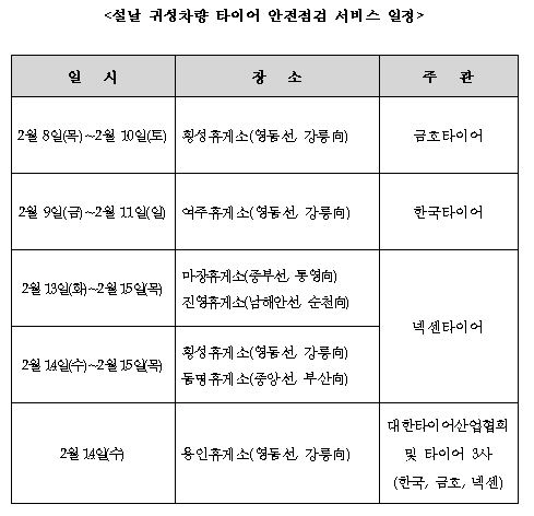 대한타이어산업협회는 설 명절 귀성객들의 안전한 운행을 위해 오는 15일까지 전국 고속도로 휴게소에서 국내 타이어업계(한국타이어, 금호타이어, 넥센타이어)와 함께 타이어 안전점검 무상 서비스를 실시한다고 밝혔다.