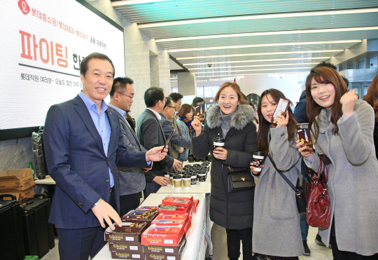 롯데홈쇼핑, 롯데제과, 롯데푸드는 13일 서울 양평동 본사에서 임원들이 출근하는 직원들에게 직접 음료를 나눠주며 격려하는 '파이팅! 한 잔 하세요' 이벤트를 공동으로 진행했다.