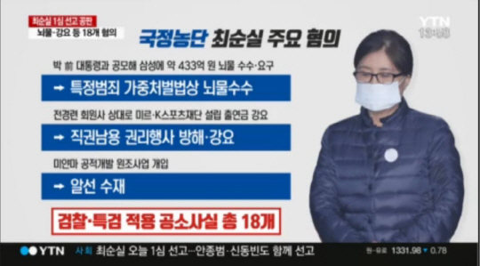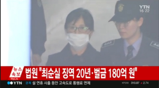 서울중앙지법 형사합의22부(김세윤 부장판사)는 13일 최순실의 혐의 가운데 대부분을 유죄로 인정하고 징역 20년과 벌금 180억원을 선고했다. 또 재단 출연 모금이나 삼성에서의 뇌물수수 등 최순실의 공소사실 상당 부분에서 박근혜 전 대통령과의 공모 관계를 인정했다.